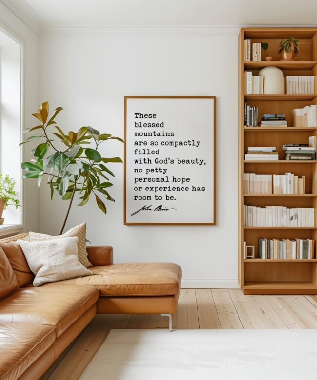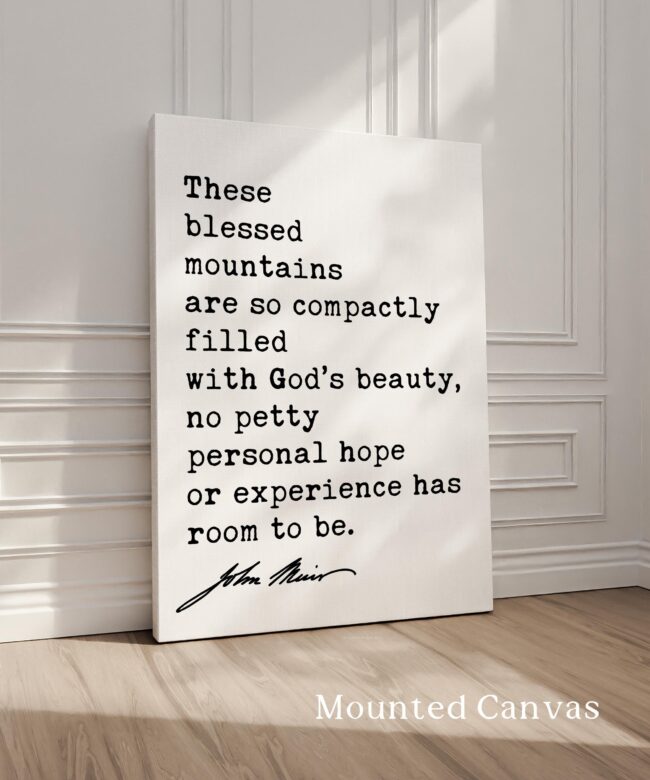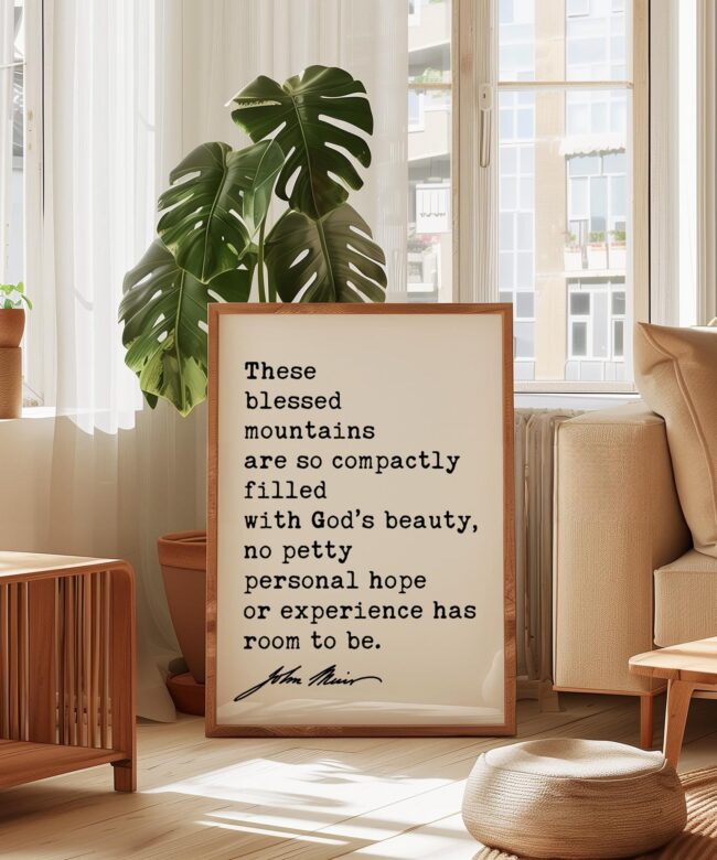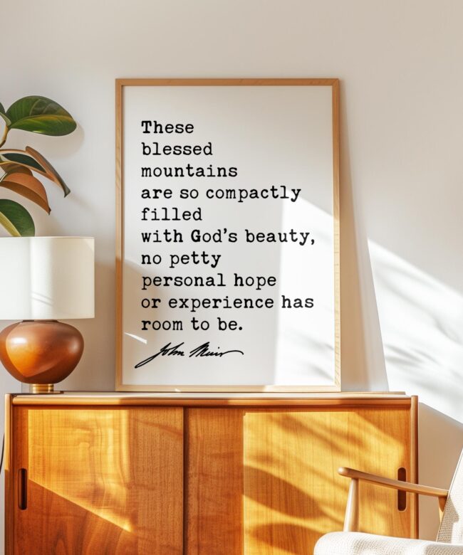 Celebrate the majesty of nature with this typography print featuring John Muir’s timeless words from My First Summer in the Sierra (1911): “These blessed mountains are so compactly filled with God’s beauty, no petty personal hope or experience has room to be.”